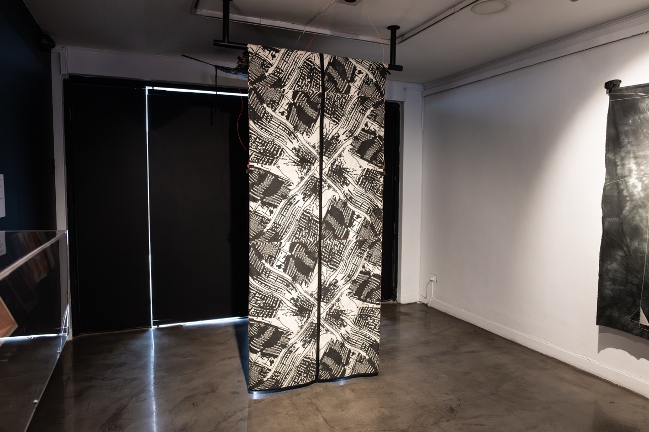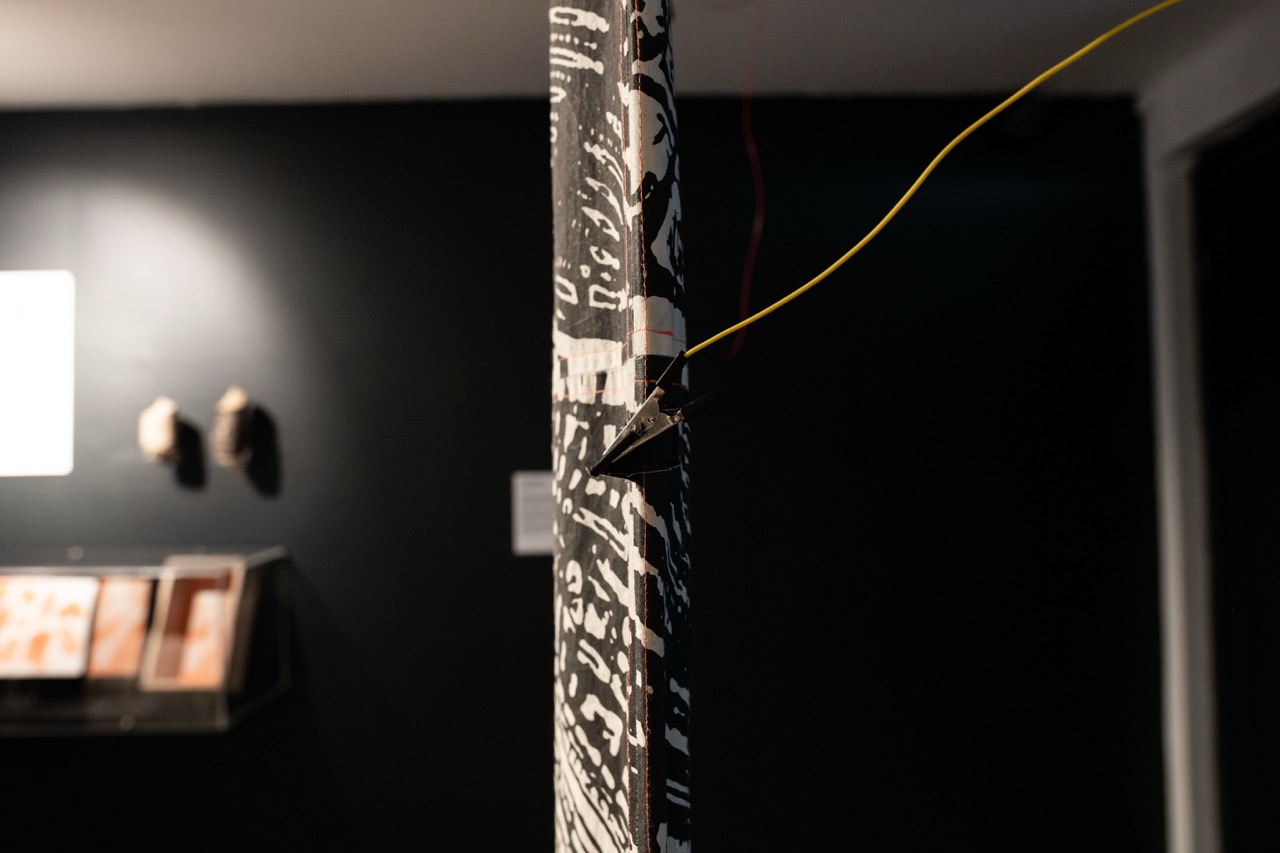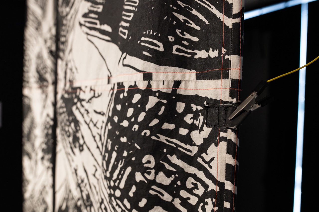 Consiste en un patchwork de 28 módulos conductivos de tela serigrafiada con tinta de grafito. Cada módulo muestra una imagen-circuito, obtenida a partir de la adaptación de una de las imágenes generadas con inteligencia artificial al inicio del proyecto Sensible al código, en 2021. Este proceso exploró las posibilidades del imaginario maquínico con el objetivo de construir un archivo útil para futuras etapas de producción. El primer paso fue recopilar imágenes desde internet vinculadas al cobre, conductor de electricidad ícono de la explotación y exportación nacional. Se obtuvieron 616 vistas aéreas de yacimientos mineros en Chile, 485 imágenes de mallas de cobre y 1.697 imágenes de circuitos electrónicos.