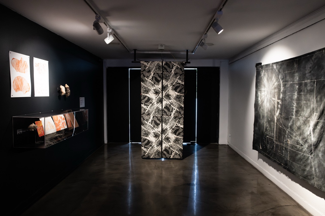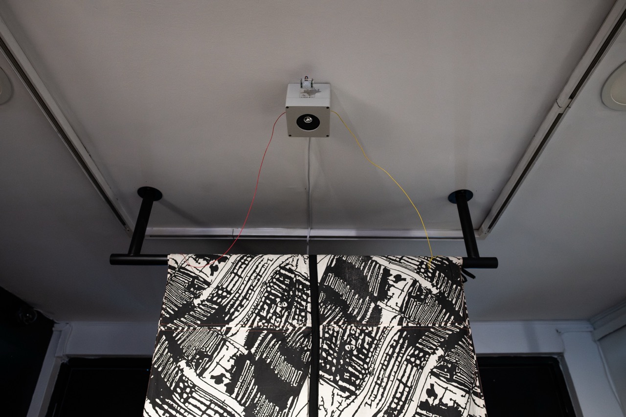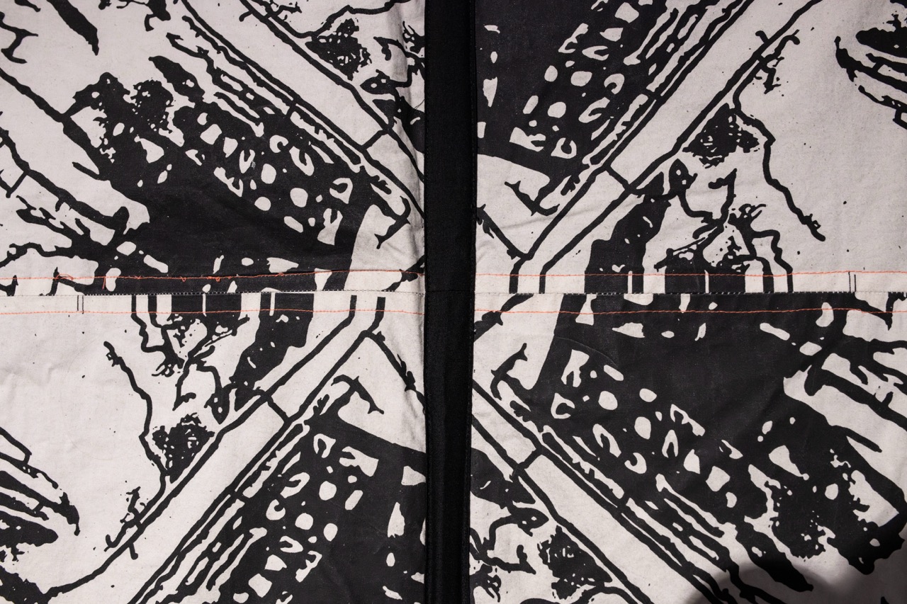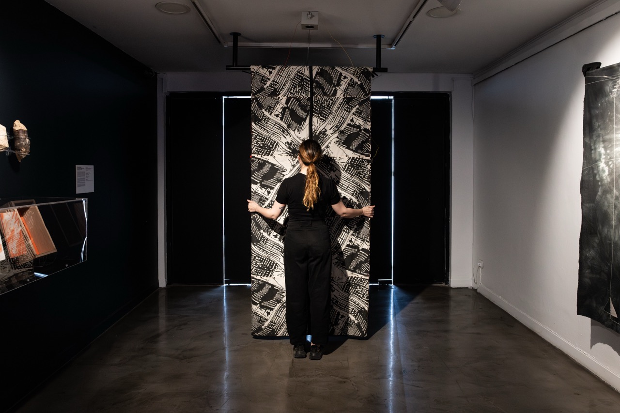 Consiste en un patchwork de 28 módulos conductivos de tela serigrafiada con tinta de grafito. Cada módulo muestra una imagen-circuito, obtenida a partir de la adaptación de una de las imágenes generadas con inteligencia artificial al inicio del proyecto Sensible al código, en 2021. Este proceso exploró las posibilidades del imaginario maquínico con el objetivo de construir un archivo útil para futuras etapas de producción. El primer paso fue recopilar imágenes desde internet vinculadas al cobre, conductor de electricidad ícono de la explotación y exportación nacional. Se obtuvieron 616 vistas aéreas de yacimientos mineros en Chile, 485 imágenes de mallas de cobre y 1.697 imágenes de circuitos electrónicos.