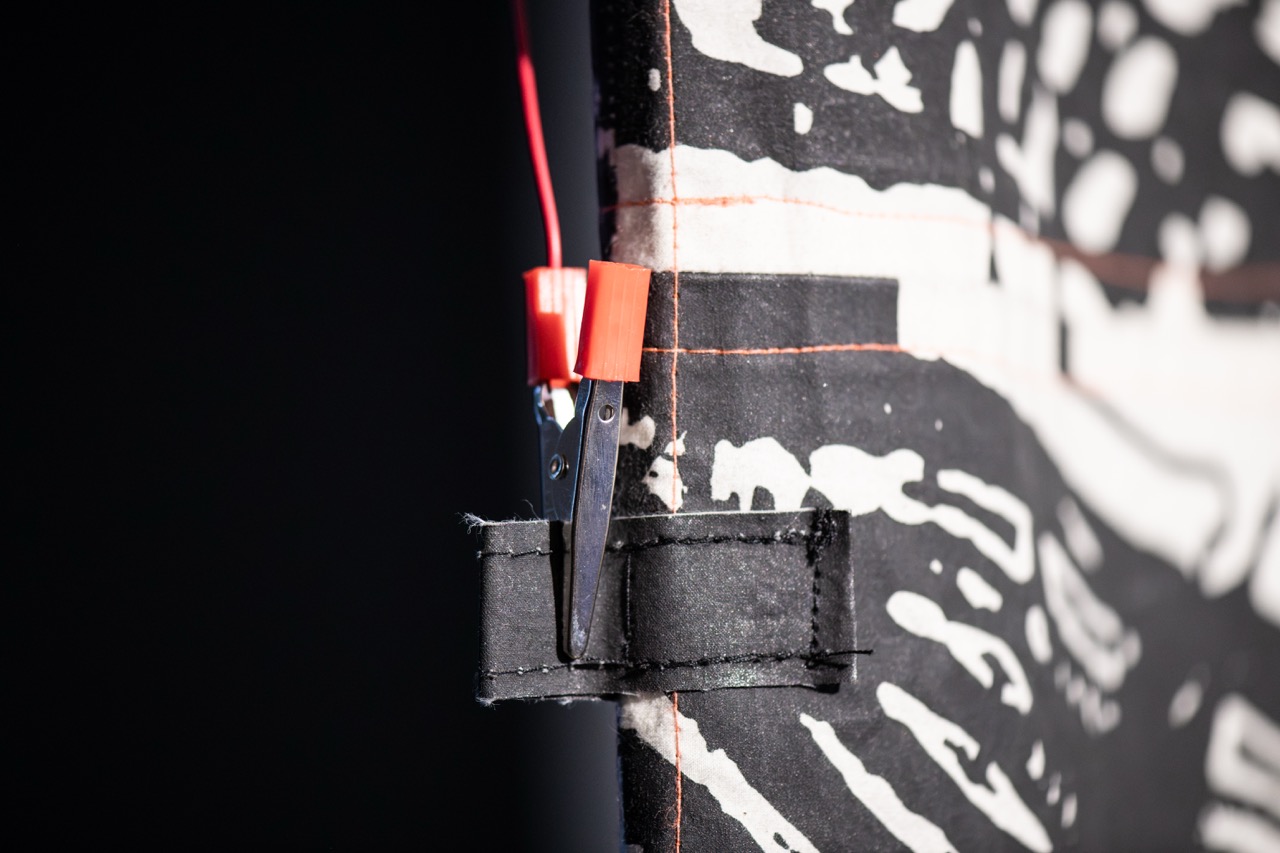 Estas fueron subidas a la base de datos de Runway y pasaron por un proceso de entrenamiento que emparejaba la base de datos con los modelos de entrenamiento del software. El modelo de entrenamiento utilizado se llamaba “faces” (Flickr), y se usó para cruzar referencias con las imágenes de internet. El ciclo de entrenamiento se llevó a cabo durante 5.000 pasos. De este proceso se obtuvieron 1.000 imágenes híbridas. Estas fueron categorizadas en familias según su similitud formal. Se seleccionó una de estas imágenes para este patchwork, la que fue sintetizada en alto contraste. Lo negro corresponde a la figura, trabajada para asegurar su conectividad eléctrica y lo blanco al fondo, que no es conductivo.