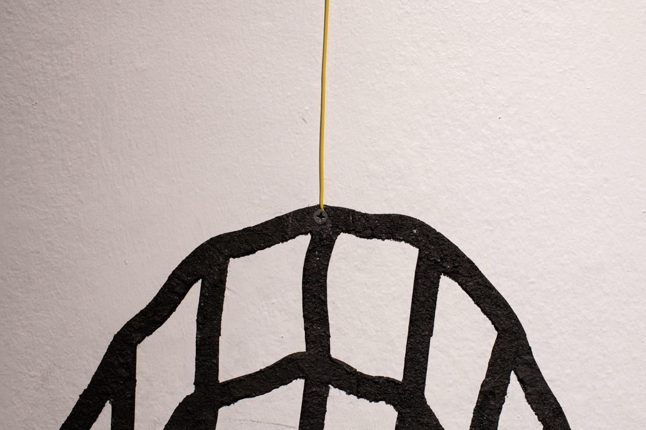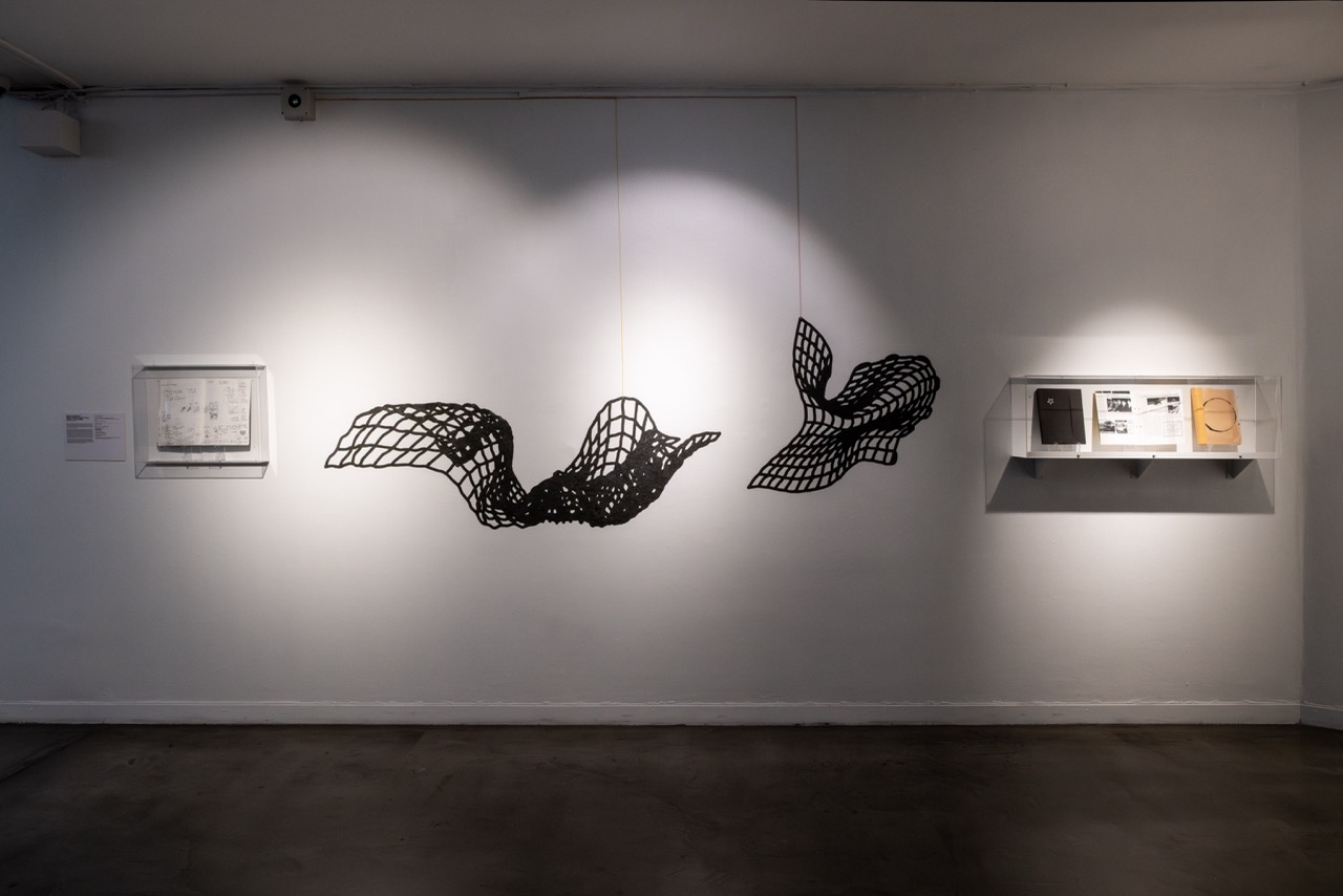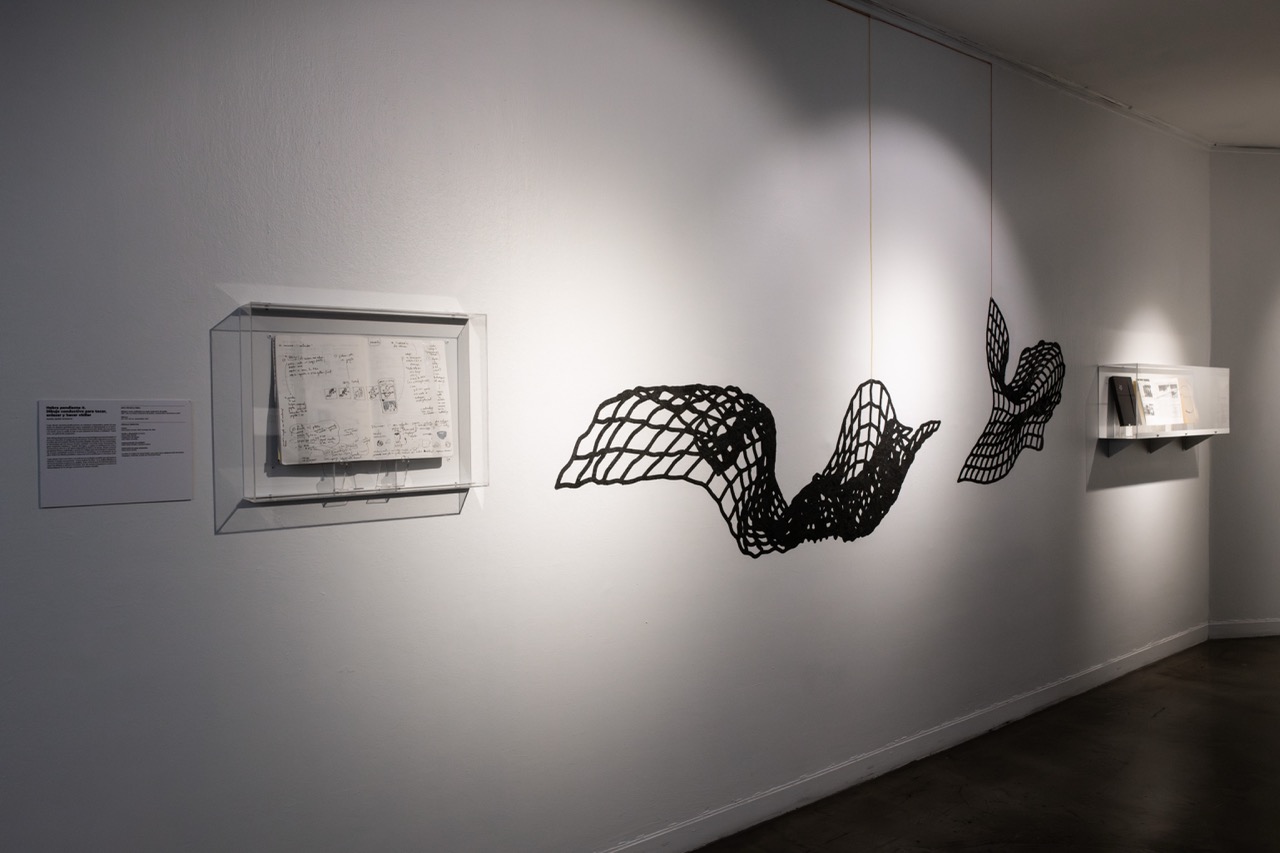 Cada diseño sintetiza gráficamente un volumen construido a partir de una malla de alambre galvanizado cuyos cuadrados se distorsionan en el movimiento de las formas que modela. Este material permite aludir, por una parte, a lo textil –pues la malla se teje en una relación de trama y urdimbre– y por otra, a la piel de las serpientes.