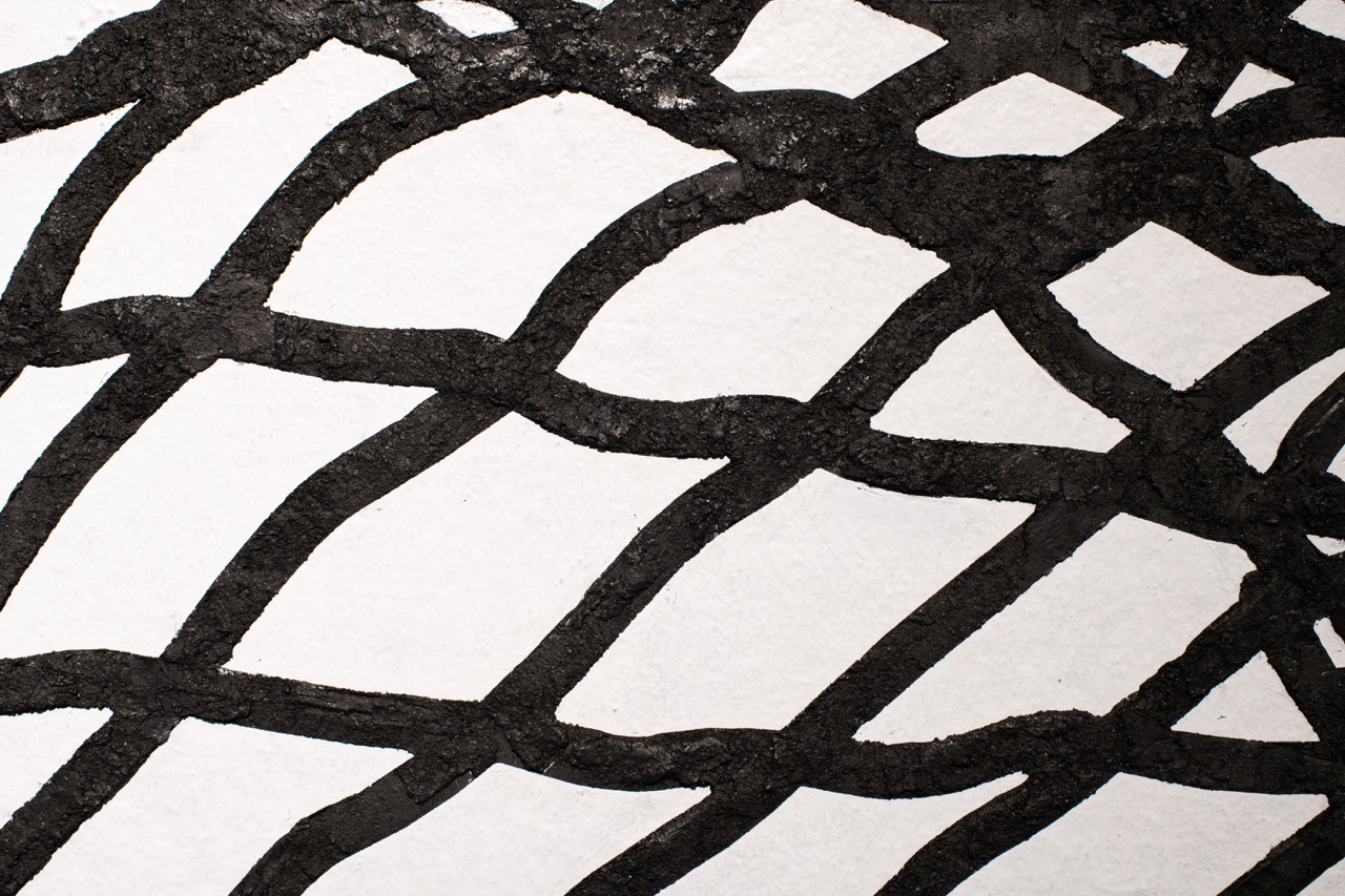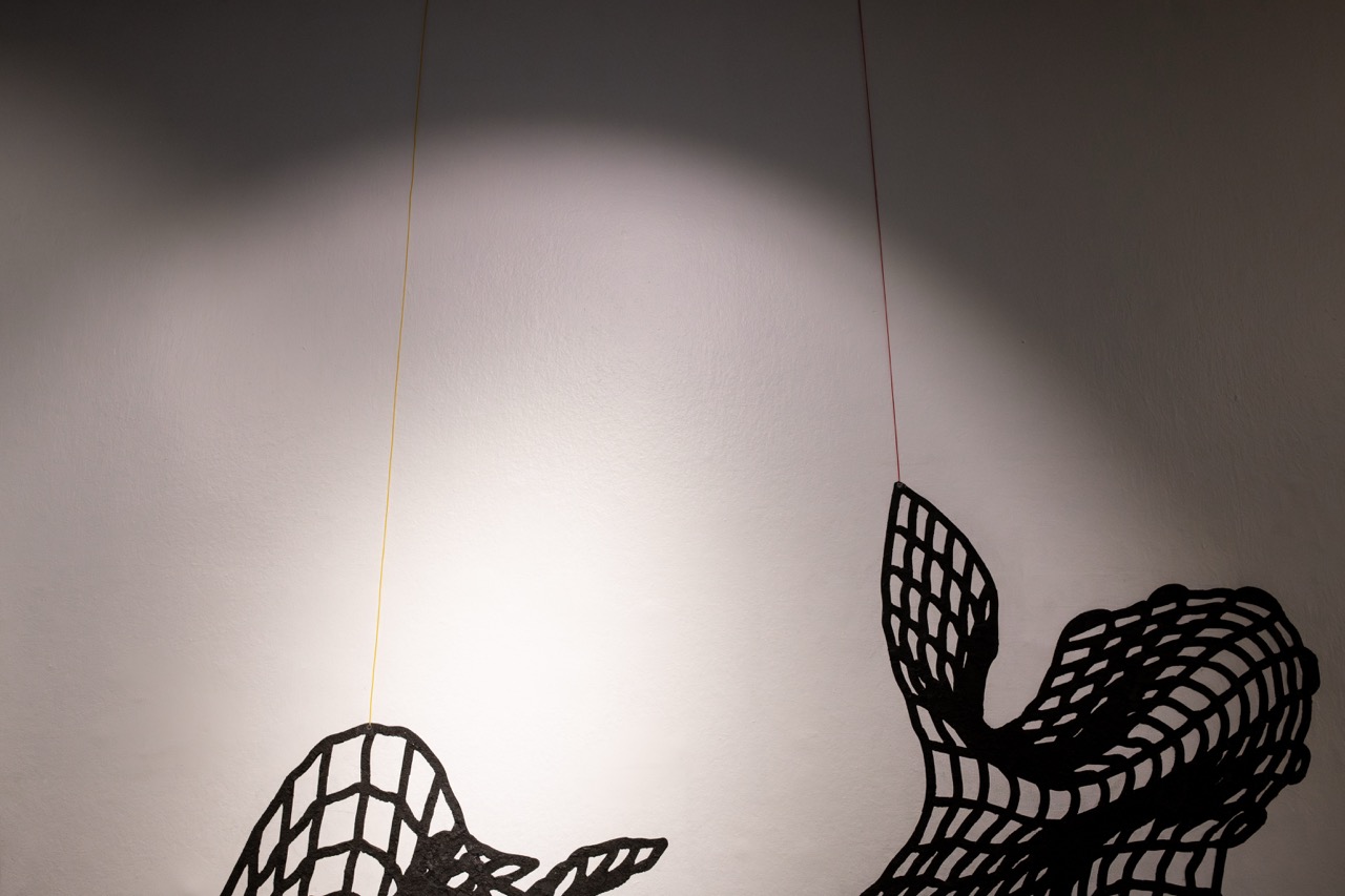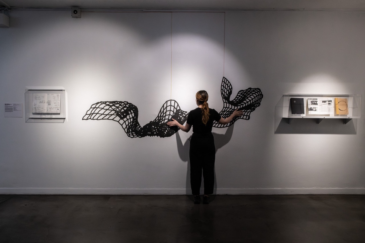 Cada diseño sintetiza gráficamente un volumen construido a partir de una malla de alambre galvanizado cuyos cuadrados se distorsionan en el movimiento de las formas que modela. Este material permite aludir, por una parte, a lo textil –pues la malla se teje en una relación de trama y urdimbre– y por otra, a la piel de las serpientes.