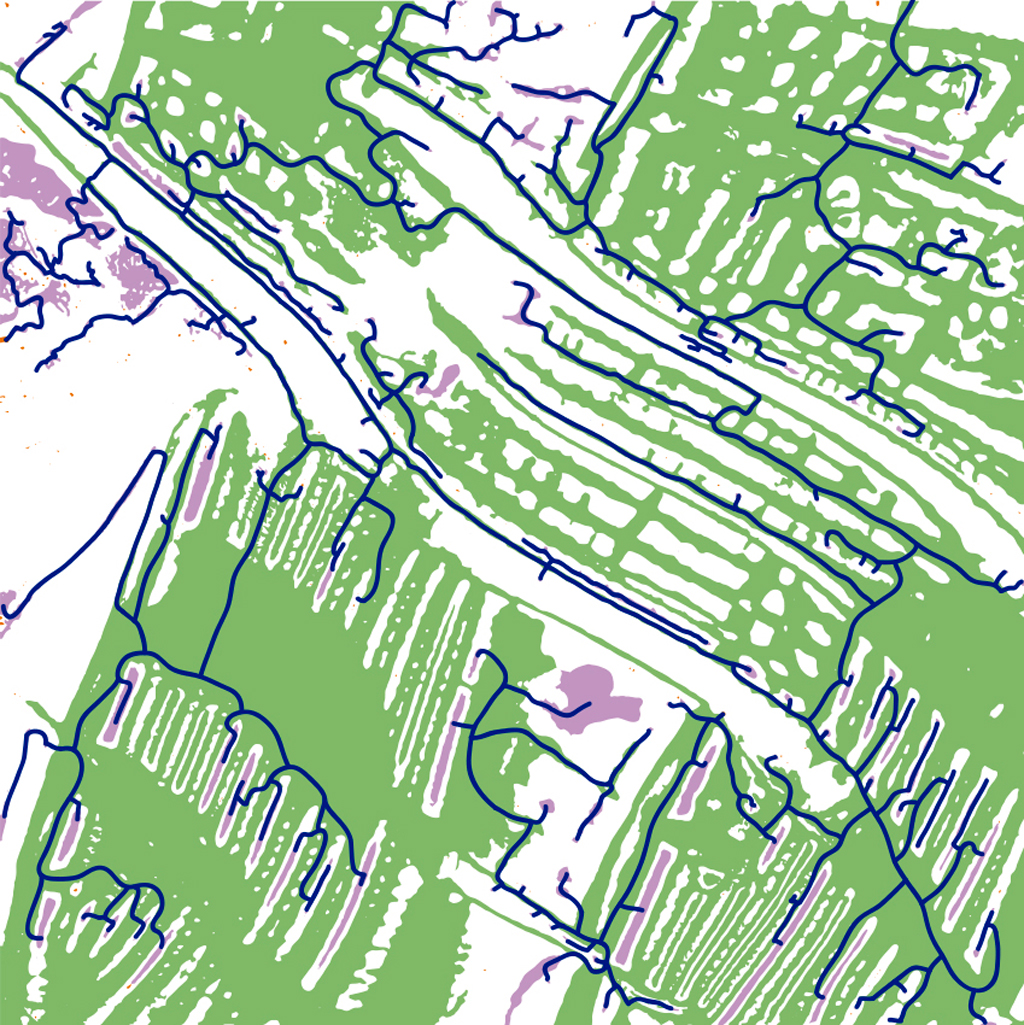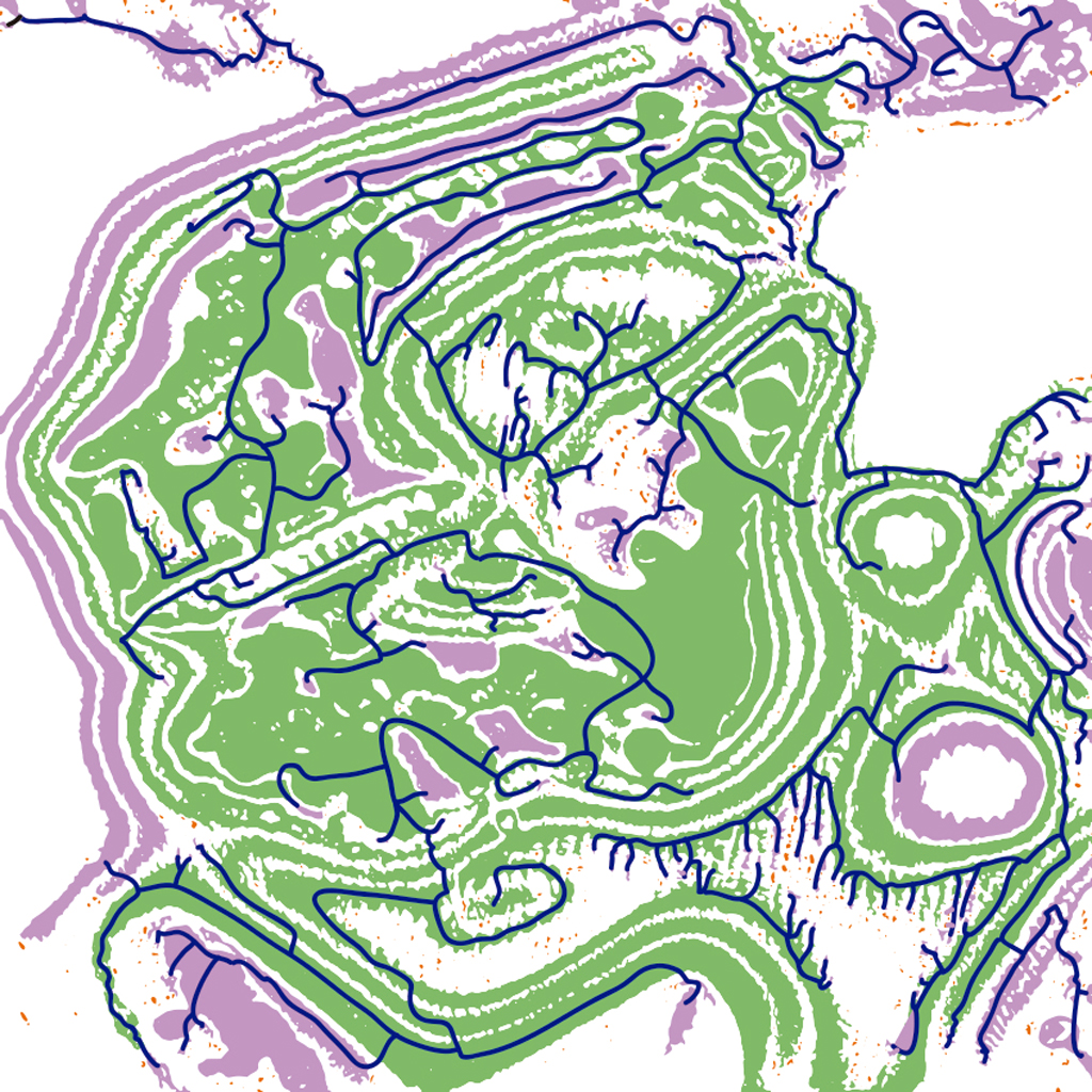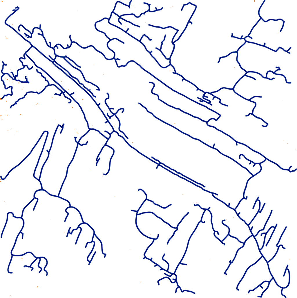 El volumen de imágenes sintéticas entregadas por el modelo fue posteriormente clasificado, y se seccionaron 3 “familias” con el fin de dar cuenta tanto de la variedad como de la secuencialidad de las imágenes maquínicas. Estas imágenes mantienen las mismas propiedades del código de las imágenes originales, en términos de color y de escala, dimensiones que fueron posteriormente editadas con el fin de logra imágenes acordes a las técnicas de impresión serigráfica y a los requerimientos de continuidad propios del trabajo con tintas conductivas. Por esta razón, las imágenes fueron llevada a blanco/negro, luego a lato contraste y posteriormente sectorizadas a modo de recuperar las texturas olvidadas dentro de este proceso.