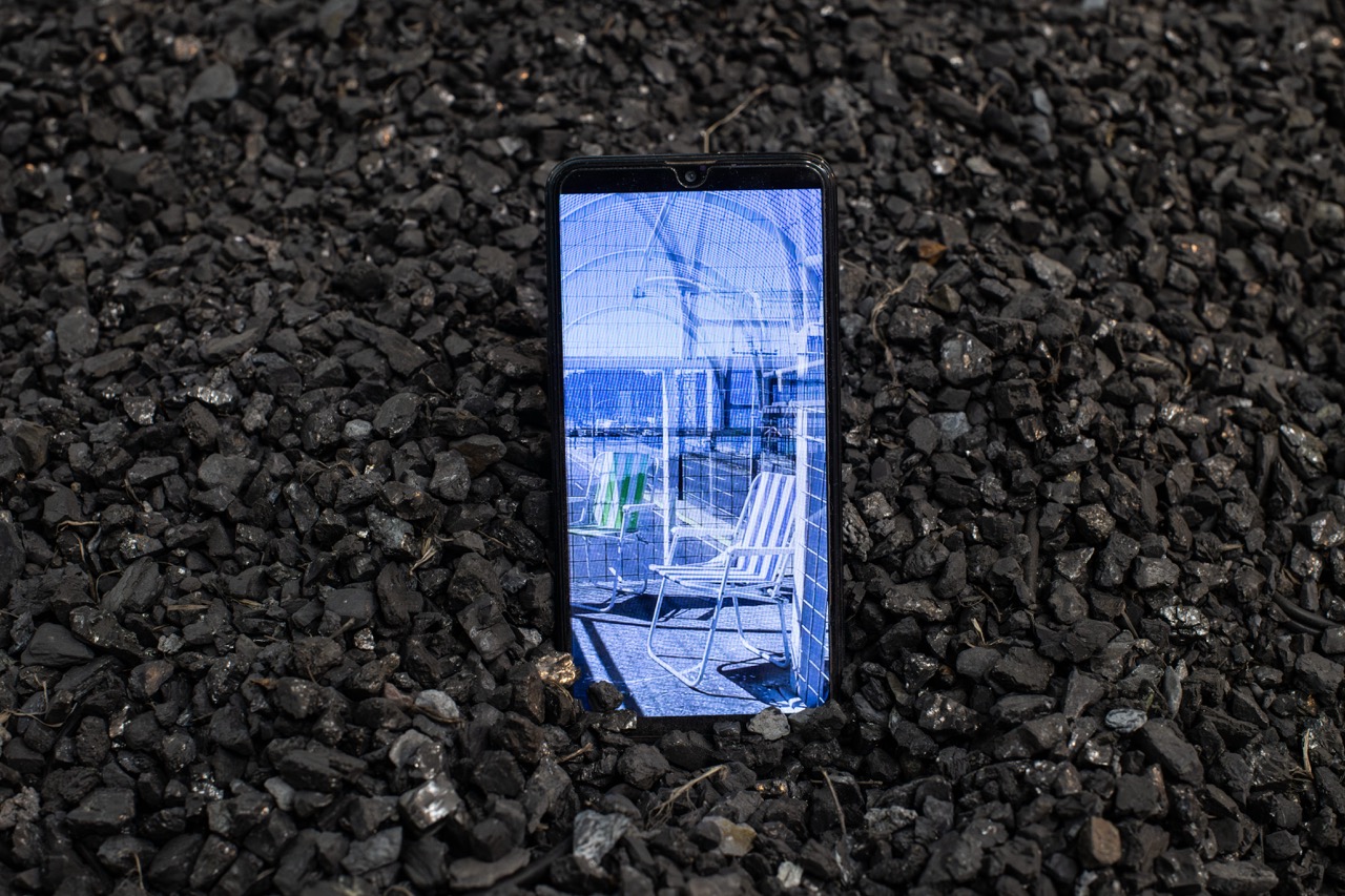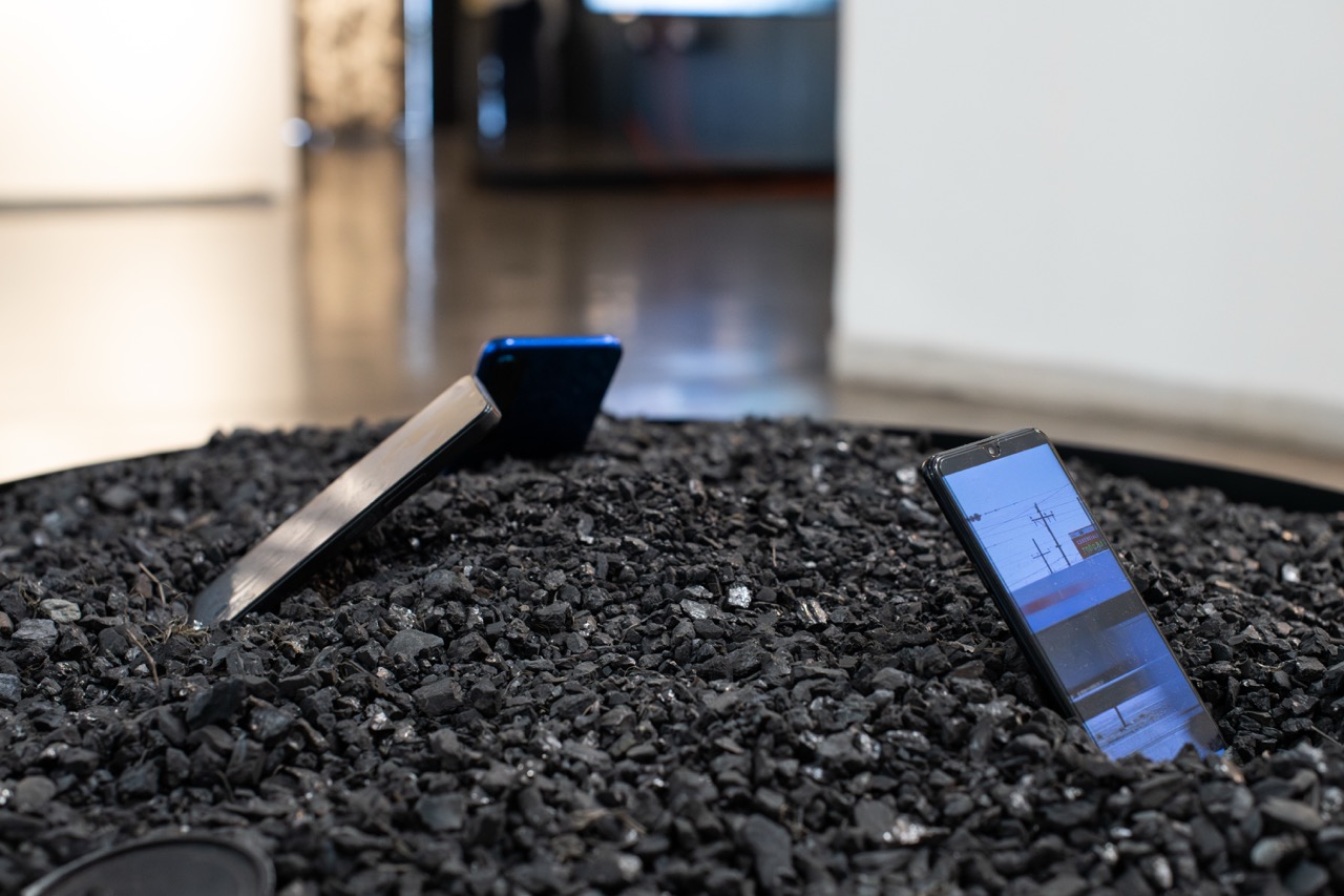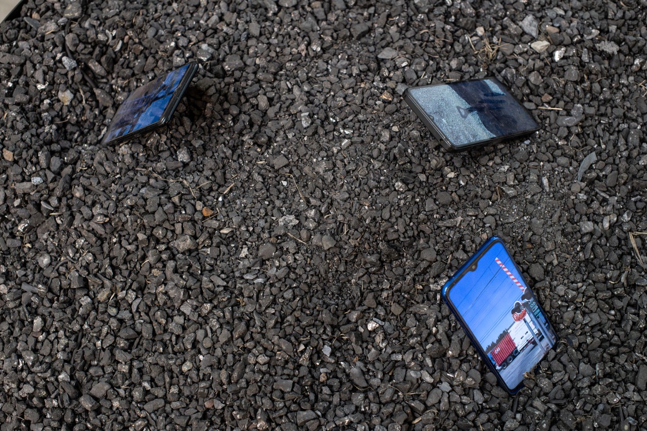 Escoria de carbón y celulares sobre bandeja de acero, 2025