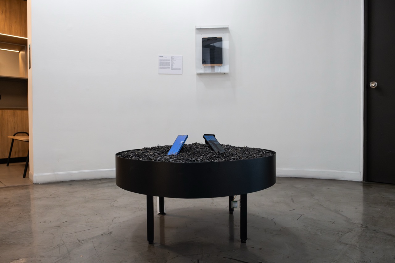 Ruta CH-160 es una instalación compuesta por una bandeja circular rellena de escoria de carbón de la termoeléctrica Santa María de Coronel, Bío Bío. Sobre ella se disponen tres celulares negros reproduciendo un video en loop cada uno. Cuenta con un clip de audio que se activa con la proximidad con la ayuda de un arduino.